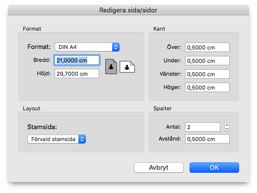 Om minst en sida är markerad i sidlistan går det att redigera sidans eller sidornas parametrar med detta menyval. (Markera flera sidor med [kommando]+klick.)