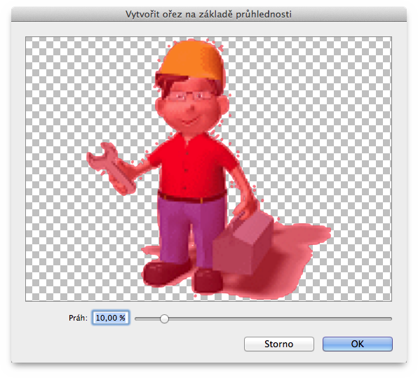 Červeně obarvená oblast zobrazená v náhledu, ukazuje účinek nastaveného prahu hodnotou, nebo šoupátkem dole. Práh 0 % vytváří obrys, který vykrývá jem bílá místa. Práh 100 % nevytvoří žádný obrys.