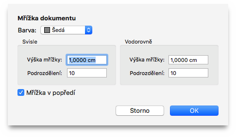 K nastavení mřížky dokumentu použijte tuto funkci. V náslesdujícím dialogu můžete mřížce dokumentu přiřadit barvu, vodorovnou a svislou šířku a podrozdělení a určit, zda má být v popředí, nebo pozadí.
