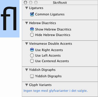 Vælg dette menupunkt til at åbne typografipaletten for OS X. Indholdet som vises afhænger af hvilken skrifttype du har valgt i Tekst-inspektøren. Mange (deriblandt de fleste ældre) skrifttyper understøtter ikke udvidede typografiske funktioner, mens de fleste af de nyere, understøtter funktioner såsom ligaturer, diacritical tegn og glyph-varianter.