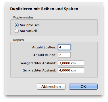 Wenn Sie diesen Menüpunkt aufrufen, werden die selektierten Objekte nicht einfach so dupliziert. Stattdessen öffnet sich erst ein Dialog, in dem Sie Kopierparameter einstellen können.