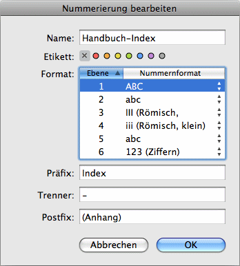 Mit einem Doppelklick auf dessen Namen in der Liste öffnen Sie den Parameter-Dialog, in dem Sie den Nummerierung-Stil umbenennen und seine Parameter einstellen können.