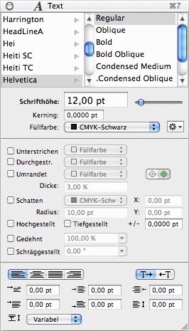 Der Text-Inspektor bietet viele Einstellmöglichkeiten, die sich leichter erschließen, wenn sie in Gruppen beschrieben werden. Alle Einstellungen wirken nur, wenn ein Textrahmen im Textmodus aktiviert ist und Text selektiert ist.