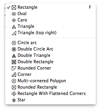 Use this tool to create shape frames. iCalamus offers a variety of pre-defined shapes, from simple rectangles to stars and corners.
