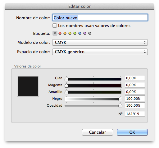 Si desea agregar un nuevo color, simplemente haga clic en el botón [+] en la esquina inferior izquierda de la Paleta de color. Una ventana ofrecerá todos los parámetros que definen el nuevo color: