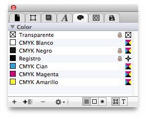 Puede asignar colores a los distintos cuadros u objetos con unos pocos clics. Tenga en mente que relleno, contorno y sombra pueden tener diferente colores. iCalamus diferencia estos colores según los tipos de formas (por ejemplo, todos los cuadros de formas) y colores para el texto.