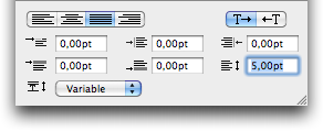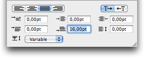 Aquí puede definir la identación izquierda de la primer línea. Si está trabajando por ejemplo en un diseño de libro clásico, y usa una altura de línea de 9pt en una altura de línea óptica de 12pt, puede fácilemente crear un inicio de párrafo introduciento un alto de línea óptico (12 pt) para la identación de la primer línea.