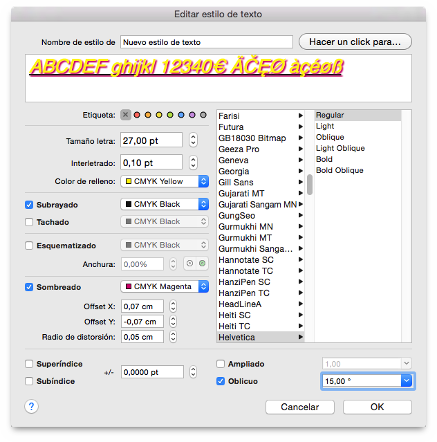 A pesar de que no es recomendado por muchos amantes de las tipografías, puede distorsionar la fuente aquí. Los amantes de las tipografías suelen en su lugar seleccionar fuentes oblícuas en vez de esta función.