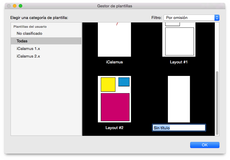 Puede guardar documentos como plantillas en iCalamus, si necesita tener los mismos docuementos como punto de partida para diferentes proyectos. Seleccione este elemento.