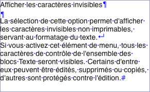 La sélection de cette option permet d'afficher les caractères invisibles non imprimables, servant au formatage du texte.
