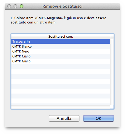 Se volete rimuovere un colore, selezionatelo nella lista colori e fate click sul bottone Meno nell'angolo basso sinistro dell'Ispettore Colore. C'è la possibilità che dobbiate scegliere un colore sostitutivo per rimuoverlo, quindi: