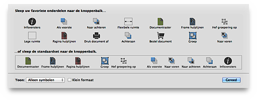 Alle wijzigingen die u aanbrengt in de knoppenbalk zijn direct actief na sluiting van het dialoogvenster. iCalamus bewaart deze wijzigingen ook automatisch en behoudt informatie over de gewijzigde knoppenbalk voor de volgende keer dat u het programma start.