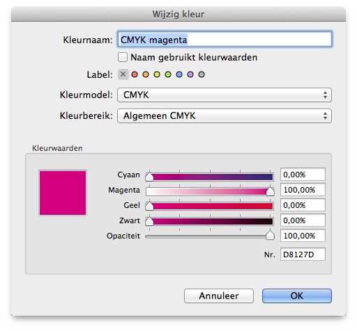 Here you can rename the color, even by using its current color values. You can also label it, e.g. to group certain colors. The label color of a color will be shown in the Kleur-infovenster color list afterwards.