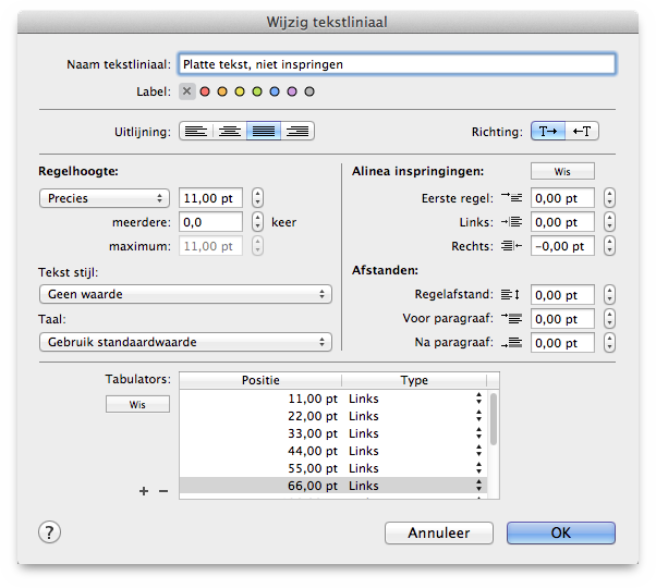 Change the tabulators which come along with all text rulers. There should be ten of them, left aligned, with 11 pt distance to their predecessors.