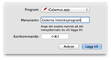 Kortkommandonska nu innehålla en post för iCalamus samt för menyvalet. Det går att redigera både texten i menyvalet och kortkommandot genom att dubbelklicka på en avdelning av posten.