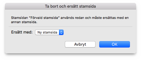 Ta bort en markerad stamsida i listan över stamsidor med detta menyval. Om stamsidan användes någon annanstans i dokumentet, måste du välja en annan stamsida som ersättning.
