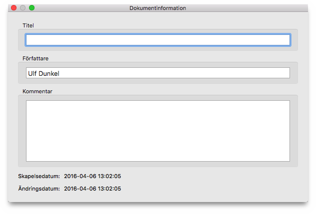 Menyvalet öppnar en fönster med allmän information om det just nu öppna dokumentet. Det går att lägga till personlig information till dokumentet.