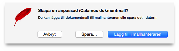Sparar dokumentet som en mall i iCalamus, om du behöver använda samma eller liknande dokument som en startpunkt i olika projekt. Välj detta menyval.