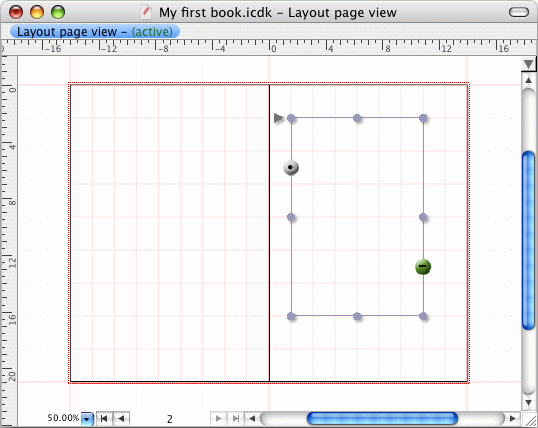 Välj nu textverktyget, och skapa en ram på den högra dokumentsidan. Den ska börja i den andra spalten och den andra raden, och vara så stor att den har två tomma spalter till höger, och två under sig, som i nästa skärmavbild: