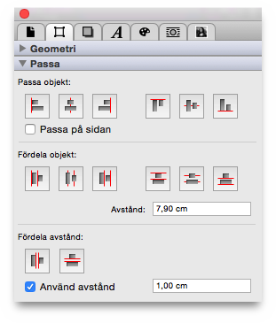 Nytt:[785], [776]: A new section Distribute Spacing has been added. These actions either distribute frames with a defined spacing or distribute multiple frames with identical spacings between the outermost frames.